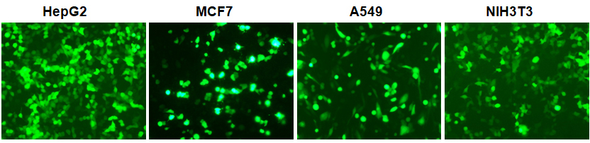 Assessment of LiFect3K™ transfection efficiencies using GFP visualization. A549, NIH3T3, HepG2, and MCF7 cell lines were transfected with a GFP-expressing plasmid using the indicated transfection reagents. Cells were visualized 48 hours post-transfection under fluorescence microscopy (GFP filter).
