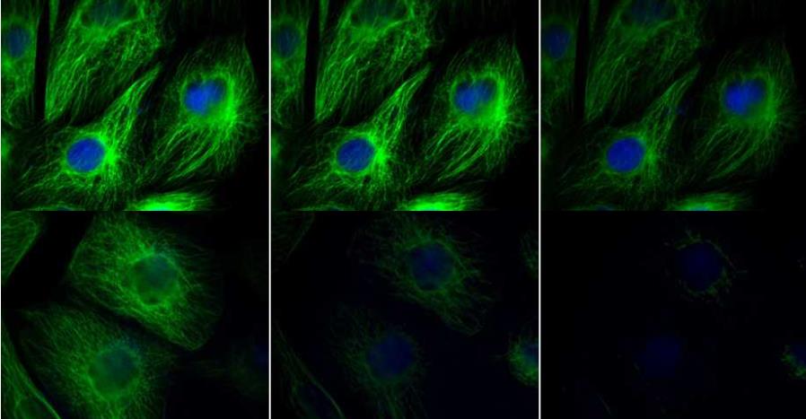 Comparison of the photobleaching rates of LiFluor™ 488 goat anti-mouse IgG antibody conjugate (top) with FITC goat anti-mouse IgG antibody conjugate (bottom).