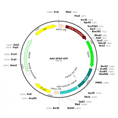 Product Category: Premade recombinant AAV; AAV-GFAP-GFP; AAV5-GFAP-GFP Description: AAV5-GFAP-GFP is a pre-packaged rAAV in serotype 5 (with capsid from AAV serotype 5 and 2xITR from AAV serotype 2) ..