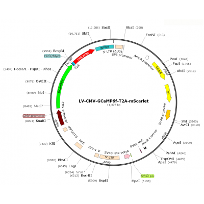 Product Category: Premade recombinant lentivirus; LV-CMV-GCaMP6f-T2A-mScarlet; CMV-GCaMP6f Lentivirus Description: GCaMP is a genetically encoded calcium indicator (GECI) and created from a fusio..