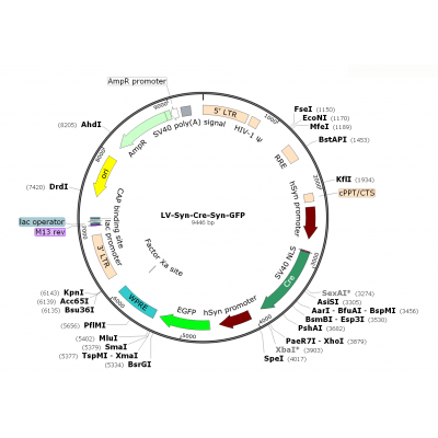 Product Category: Premade recombinant lentivirus; LV-Synapsin-Cre-Synapsin-GFP; LV-Syn-Cre-Syn-GFP; LV-hSyn-Cre-hSyn-GFP; Syanpsin-Cre-Synapsin-GFP Lentivirus Description: Lentivirus Syn-Cre-Syn-GFP ..