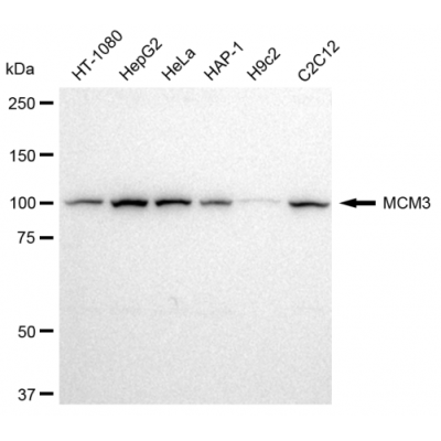 Reactivity: Human, Mouse, Rat Applications: WB, IF/IC, WB-KD Isotype: IgG Clone: 23GB2490 Host Species: Rabbit Clonality: Monoclonal Synonyms: MCM3; Minichromosome Maintenance Complex Component 3; DNA Polymerase Alpha Holoenzyme-Ass..