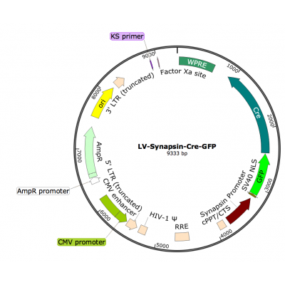 Product Category: Premade recombinant lentivirus; LV-Synapsin-Cre-GFP; LV-Syn-Cre-GFP; LV-hSyn-Cre-GFP; Synapsin-Cre-GFP Lentivirus Description: Cre recombinase is a type I topoisomerase from bacteri..