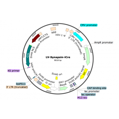 Product Category: Premade recombinant lentivirus; LV-Synapsin-iCre; LV-Syn-iCre; LV-hSyn-iCre; Synapsin-iCre Lentivirus Description: Cre recombinase is a type I topoisomerase from bacteriophage P..