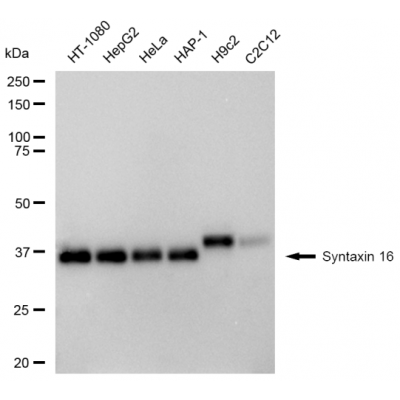 Reactivity: Human Applications: WB, IF/IC, FCM, WB-KD Isotype: IgG Clone: 23GB4655 Host Species: Rabbit Clonality: Monoclonal Synonyms: STX16; Syntaxin 16; SYN-16; SYN16; Syntaxin-16; Hsyn16; HSYN16; Syn16Immunogen: A synthesized pe..