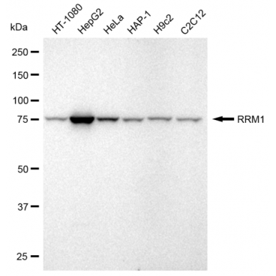 Reactivity: Human, Mouse, Rat Applications: WB, IF/IC, FCM, WB-KD Isotype: IgG Clone: 23GB960 Host Species: Rabbit Clonality: Monoclonal Synonyms: Ribonucleotide Reductase Catalytic Subunit M1; Ribonucleoside-Diphosphate Reductase L..